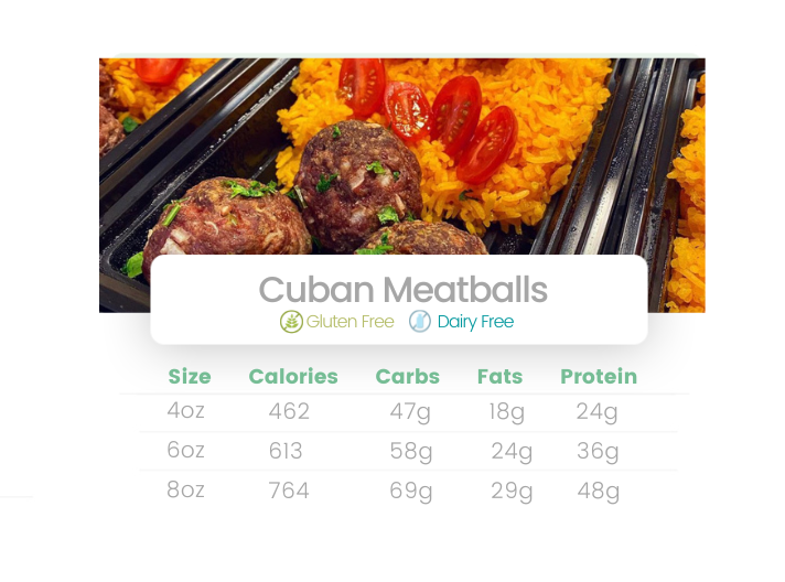 Lean ground beef meatballs seasoned and stuffed with minced onions and fresh garlic. Served with yellow Spanish rice, cherry tomatoes. Sub cauli/brown rice-$0.90