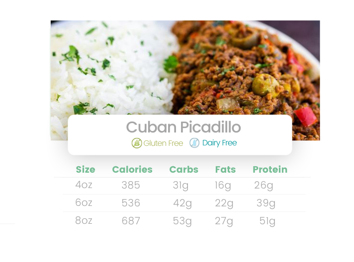 Lean ground beef simmered with fresh onions, garlic, golden raisins, and olives. Served with steamed jasmine rice and sweet baked plantains.