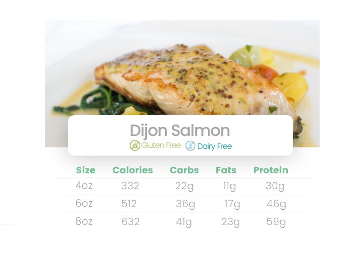 Dijon mustard baked salmon served over a bed of quinoa with fresh steamed greens.
