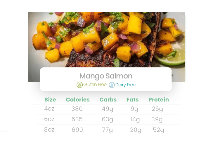Blackened salmon served over cilantro lime rice and topped with pineapple mango salsa.
