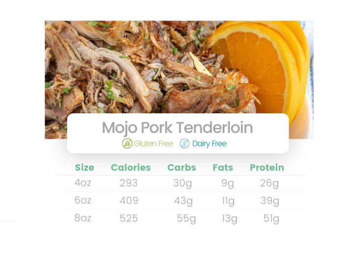 Lean pork tenderloin slow cooked in cuban style broth served with yellow Spanish rice, sweet plantains, and cherry tomatoes.