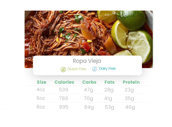 A Cuban traditional dish of slow roasted chuck beef in a tomato sofrito base sauce. Served with jasmine rice and sweet plantains.
